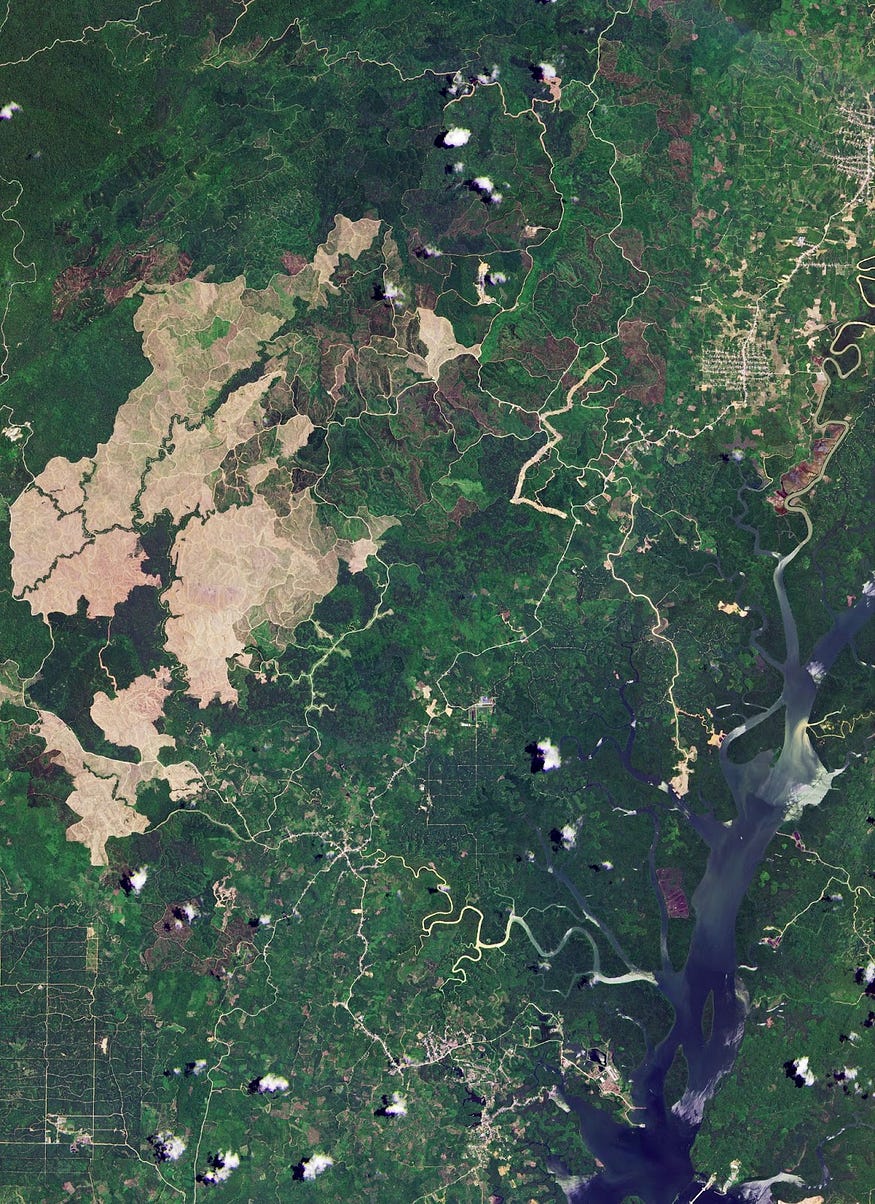 Egy út megjelenése az ilyen területeken gyakran jelzi a jövőbeli erdőirtási tevékenységet . Vagy Indonézia tervezett Nusantara városa esetében az utak kezdik kirajzolni az alaprajzát.